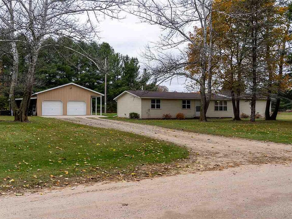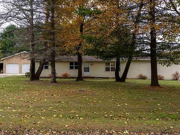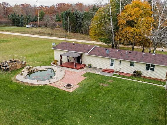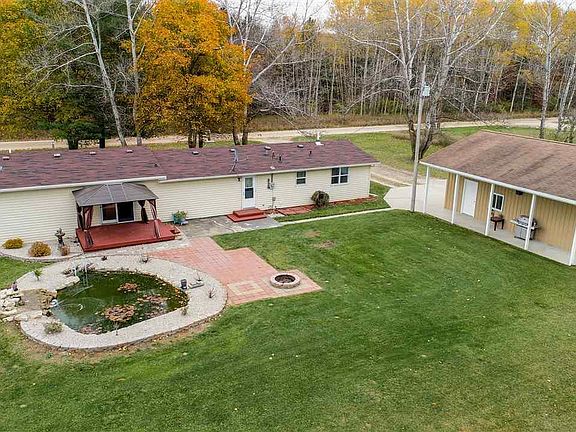 Beautifully cared for ranch home on 5 acres with a 32x32 pole barn and lean to. There are three bedrooms on one side of the house and the master on the opposite end with the kitchen and family room in the center of the home. The master features a walk-in closet and private master bath with jetted tub and shower. The house has two furnaces; one is equipped with a smart thermostat and was recently installed. The kitchen has a newer stainless steel refrigerator and features a pantry with a decorative barn door. Seller replaced the windows two years ago. The french doors of the family room lead out to a spacious deck overlooking a landscaped coy pond and a beautifully maintained backyard. If you enjoy growing vegetables, you will enjoy having a fenced in garden area to protect it from deer and other wildlife. Lots of storage at this house with the 500 square feet of unfinished basement space! Listed as Chippewa Hills School district but can also be Beal City school district.