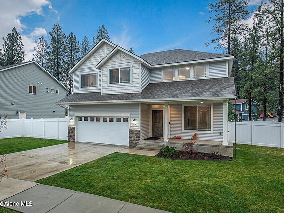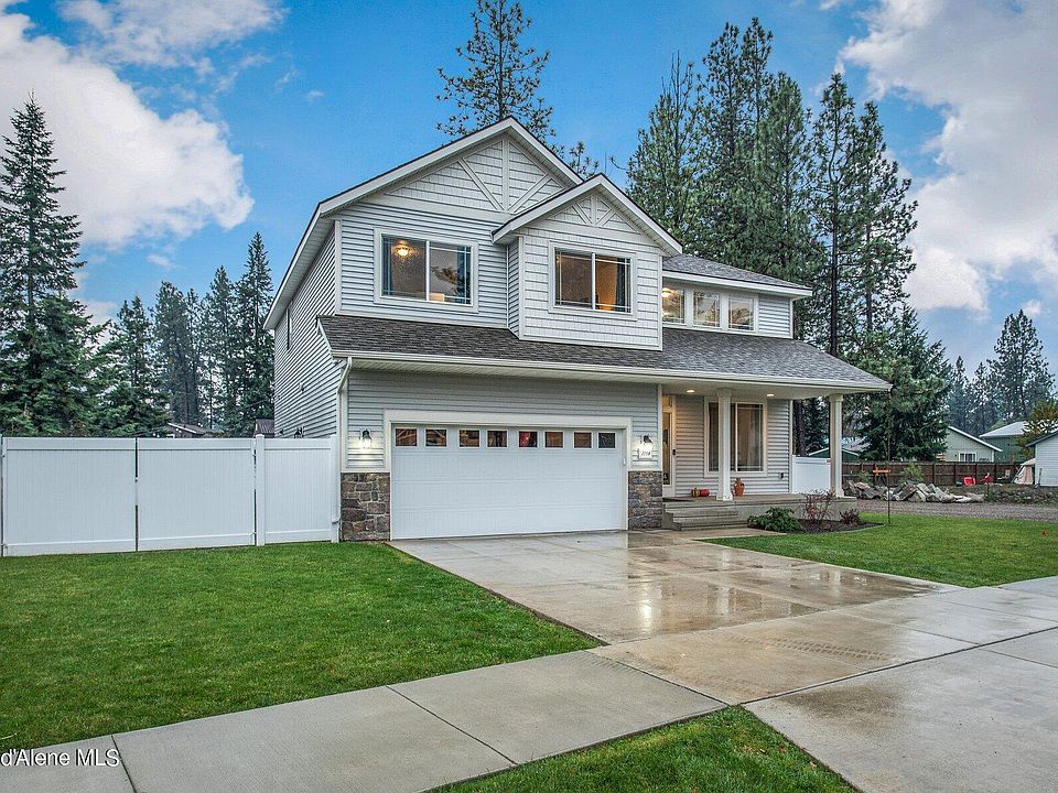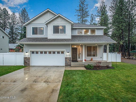 Awesome floor plan in Rathdrum's Timber Landings, this home is close to schools, town, and activities! The large, covered porch with knotty alder front door greets guests and adds to the street appeal of this home with its stone and shake exterior accents. The office is off the entry for privacy while the family room with its coffered ceiling and adjoining open concept kitchen to the back invites gathering. 42'' kitchen cabinets; SS Whirlpool appliances; large island w/eating bar overhang; Moen pullout faucet; walk-in pantry; A/C. Upstairs you will find the Master ensuite w/5' shower and separate garden tub, 3 additional bedrooms, centralized laundry, and an oversized loft space. Fully fenced, landscaped with a 12 x 10 covered back patio and RV parking, there is plenty of room to bring your toys or entertain!