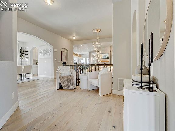 This incredible home is breathtaking from the moment you walk in the door. The front foyer invites you in with large plank hardwood flooring and natural light beaming from the picturesque windows. Just off the foyer an office space for is perfect for the work from home individual. The open concept floor plan flows from the foyer to the formal dining room in through the eat in kitchen and around to the living room. The cozy living room is centered around a beautiful fire place and mantle. Just off the living area the stool height breakfast bar makes the area perfect for entertaining. Stone counter tops, stunning white cabinetry, and stainless steel appliances make the kitchen pristine. The informal dining area walks out to the lovely back yard perfect for summer bbq'ing. The main floor also features the master bedroom with walk in closet and five piece ensuite bath featuring a garden tub, luxurious shower, and marble countertops with double vanity. The basement level has a large family room with four large bedrooms just off the main area with two full size bathrooms. This property has it all and is minutes away from schools, hiking/biking trails, pools/parks, pickle ball courts and dog park. The Banning Lewis Ranch community has amenities galore, including neighborhood schools, over 75 acres of parks/trails/open space, tennis courts, basketball court, rock climbing parks, zip-lines, access to pools, splash pad, water park, and dog park. Recreation center houses a fitness center and also regularly hosts classes and events for all ages. In the summer months, catch a neighborhood concert, festival, food trucks, farmers market or enjoy other regular community events.
