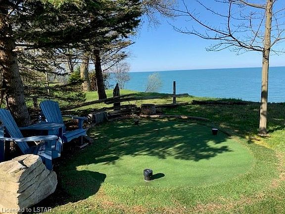 What a fantastic spot to relax and unwind in this year round cottage right on Lake Huron in Poplar Beach, about 5 minutes north of Grand Bend. It has all the charm of a cottage with the pine walls and ceiling, but the comforts of home with a gas furnace (2014) and central air (2015) basement spray foam insulated in 2011, windows replaced (2014/2015). You'll enjoy entertaining friends and family in the new kitchen (2018) with quartz countertops, and a great view of the lake from the kitchen table! The living room features a gas fireplace (2011) and the dining area has large windows overlooking the lake, sliding door to the deck. New flooring throughout. Bathroom new in 2015 features walk in shower with attractive tile, new vanity, toilet, flooring. Amazing lakeside yard with a putting green, gazebo with electrical, outdoor granite bar, composite deck. There is a steel seawall at the lake installed in 2019. Beautiful landscaping and walkways. Garden shed (roof 2020). Municipal water, reverse osmosis water purification installed 2021. Full septic system. Stellar view and one of a kind sunsets to enjoy, starting NOW!