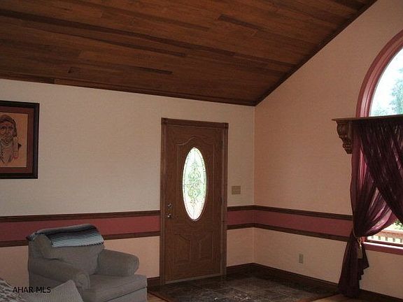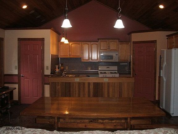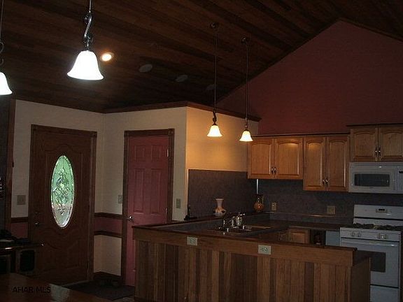 On 3.47 ACRES! PLUS - A STONE'S THROW FROM MASSIVE STATE GAME LANDS! AND you have to see the inside of this home!! The LR, kitchen and dining area are an open floor plan. The ceiling is vaulted w/poplar wood, plus pendant & recessed lighting. The LR has hardwood maple floor, large rounded window at front, & built-in entertainment unit. The kitchen and cook stove have marble floor, light maple cabinets & boasts large WIC & pantry. Three bedrooms-all have large closets of hanging & shelving; maple floors. Full bath has ceramic tile. The downstairs is great w/office area; bonus room that you enter through French doors; a 26x26 family room w/kitchenette, torchiere lighting at corners, wainscot. Beautiful 3/4 bath off FR. Really low utilities. 42x6 deck on left side plus 28x16 deck at front!