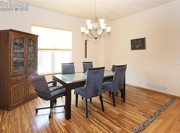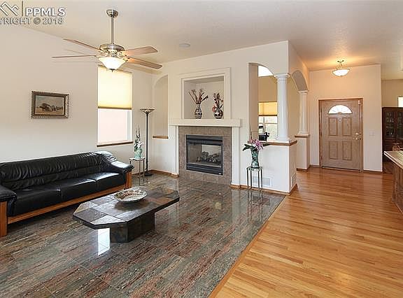 This immaculate home offers an attractive, bright, and open floor plan that backs to open space! * Central air * 3-car garage * Abundant hardwood and tile flooring on the main level * 2-sided gas fireplace * Spacious eat-in kitchen with tile counters and backsplash, breakfast bar, pantry, and plenty of storage and counter space * Accommodating master bedroom with walk out to deck, adjoining 5-piece bath with a double vanity, soaking tub, separate shower, and walk-in closet * Main level laundry * The fully finished walkout basement with 9ft ceilings offers plenty of space with a sizable rec room with wet bar, gas fireplace with blower, two additional bedrooms, two full baths, and a storage room * Xeriscaped front yard * Expansive back deck * Conveniently located near shopping and restaurants * Additional features include large living spaces and bedrooms, plentiful windows, recessed lighting, vaulted ceilings, an automatic sprinkler system, central vacuum, security system, whole house filtration system, humidifier, in-ceiling speakers, linen closets, and cellular blinds throughout * Pet, smoke, and child free home * Conveniently located near schools, shopping, restaurants, and Peterson AFB.