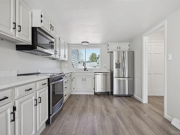 MUST SEE incredible Main floor primary bedroom home in Glenn Oaks community! This home has been completely updated & remodeled including opening up the kitchen to the dining room and new quartz counter tops in the kitchen. New luxury vinyl plank floors in kitchen, dining room and foyer. Brand new carpet throughout the living room, bedrooms and hallways. Brand new bathrooms on both the main floor and the upper floor, with a double vanity on the upper level. Upper bedroom has a walk-in closet for ample storage. Living area is south facing for sun all year. The patio right outside the living room is surrounded by beautiful high quality privacy fencing around the back patio area and steps away is the community pool. Gated court yard leading to front door with large planters (are included). Oversized garage (26'x21') and a built in storage room with shelving built in. Gas log fireplace. . Walk to the Streets of Southglenn Town Center for shopping, restaurants, theater, summer concerts. Walk to King Soopers. Walking and biking trails are nearby.