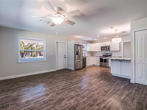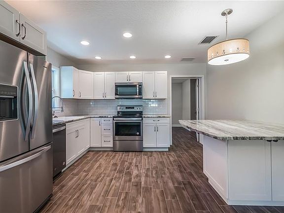 Totally Rebuilt/Renewed 3/2 Great room home. 2017 permitted: roof, impact windows and doors, updated electrical, plumbing, 15 SEER HVAC, porcelain wood tile flooring throughout, shaker thermofoil kitchen cabinets with exotic granite, dining tabletop built in island area in kitchen, subway tile back splash, all new SS upgraded appliances, disposal, energy efficient water heater, custom doors, large profile base and cased windows, bathrooms include all new tile, wood cabinets, granite, Kohler tub, toilets and Delta faucets, new R30 insulation, drywall, lighting, rear deck, complete privacy fence, stone look tile front porch, partial sod and plants, multi zone portable irrigation system. This house is better then new, won't last long, call today for your private showing!