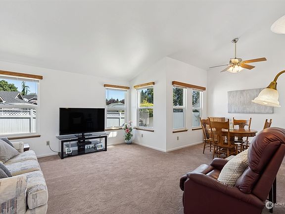 Light flooded interior, impressive cathedral ceilings & spacious layout designed for modern lifestyle living! Well maintained rambler on a large corner lot location, fully fenced in quiet cul-de-sac. Open living room flows into dining space & high ceiling kitchen, w/eating area or extra counter space. Private primary suite in it's own end of the house, w/double doors, closets & attached bath w/shower. Two other bdrms, or use one as office, + full bath. Imagine unwinding & relaxing in your spacious backyard, complete w/trex deck for entertaining + landscaping & green grass. New exterior paint, heat pump w/AC! Conveniently located in Mukilteo Sch Dist. Minutes away from shopping, golfing, entertainment, freeways, Amazon, Boeing & Paine Field.