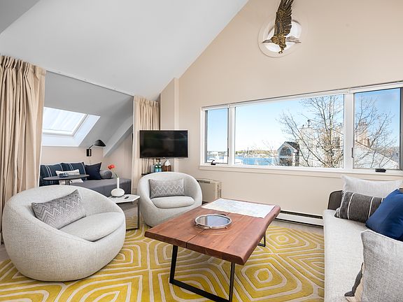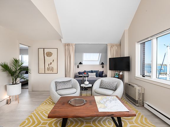 Chandler's Wharf is truly a location that cannot be beat. The community is right on Casco Bay and the view is over Dimillo's Marina where sunsets, sailboats, kayaks and occasional seals enhance your living scenery. You are mere steps to Commercial Street and the Old Port where award winning restaurants, shopping, galleries and small Maine treasures abound. This rental is offered for a year lease, no exceptions, and is ideal for an individual or couple looking to move to southern Maine for work or to try living here across the seasons. Unit 719 is a fully furnished 1-bedroom, 1.5 bath condo on the fifth floor with elevator access. The space has ample natural light and touches of both mid-century modern and coastal furnishings. Attractive fine art, lighting and plants are placed throughout. It recently has had some lovely renovations including coastal white washed floors throughout, central air and both bathrooms have been completely remodeled. Despite the central city location, these units are built to insulate guests from noise. The rental includes one covered parking space and there is a 24 hour gatehouse for security. Kitchen & Living: The focal point of the living area is a large picture window overlooking the harbor. At the peak of the roof line is a small circular window with a sculpture of an eagle taking flight. An area rug with mustard-yellow and cream adds an extra touch of sunshine in the room. There is a couch and two cozy armchairs around a large teak coffee table. A flat-panel TV is mounted across from the couch. A very clever use of space is an alcove with a sky light turned into a "cabana" style lounging area. It can be used to extend the living area or closed off as a guest space. The couch doubles as a queen sized-bed and there are privacy curtains to close off the area. Off of the living area is a home office with a fabulous orange shag rug, leather arm chair and desk with two lamps. Above the desk is a skylight so even if you are working, you can feel a bit of the outside world and you will always know what the weather is! The galley kitchen has granite countertops and stainless appliances including a refrigerator, dishwasher, a four burner electric stove, plenty of cabinets for storage, coffee maker and electric tea pot. Over the large bay sink, two windows allow you to gaze out to bustling Commercial Street. For dining, there is a round, glass topped table that seats four with a modern pendant light overhead. The half bath in this living space has a sleek and modern vibe with floor to ceiling subway tiles, gray honeycomb flooring, a large mirror that has "selfie lighting" and a European-style floating toilet. The washer and dryer are located behind sliding doors with frosted glass. Primary Bedroom & Full Bath: This ensuite space has a queen-sized bed made with the luxurious linens that Apex chooses to use for their guests. There are three windows behind the bed that allow the summer ocean breeze to filter in as you sleep; there are also privacy shades. Two walnut night stands with drawers and lamps flank each side of the bed. There is also a large walnut dresser. There is a sleek desk in here as well should a couple both need spaces for working. A large walk-in closet with a frosted glass door is ample space for your clothing. The brand new bathroom has granite floors and an oversized glass shower with both a rain shower overhead and a hand-held option. There is a recessed shelving niche cut into the tiled wall to hold your grooming items, as well as a wooden stool. There is a large mirror over the porcelain sink and two drawers for storage underneath. Another clever use of space is behind the door: Two flat paneled medicine cabinets double as a full-length mirror. Fabulously renovated to also include a new Toto washlet bidet seat. If you are looking to relocate to Portland for a year, this Chandler's Wharf condo is a divine choice. 1 year term required, no exceptions per association. Tenant pays utilities. Parking included. First, last, security collected at lease inception.