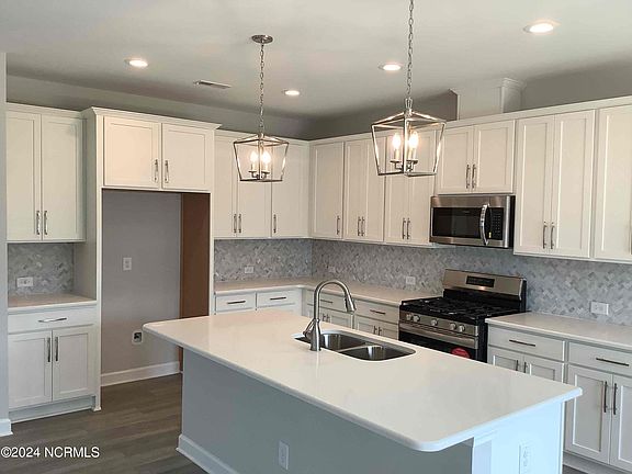 Kitchen open to great room with island and dining area, quartz countertops in ''Elegance'', white shaker cabinets, and natural stone herringbone mosaic tile backsplash; Stainless steel microwave, dishwasher, and gas range.