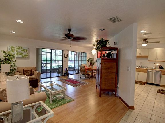 Immaculate ground floor home in desirable West Melbourne. The well-appointed eat-in kitchen has new stainless steel appliances, ceiling fan and faucet. Spacious master boasts his & hers closets and a full bath. Sliding glass doors in both living and dining rooms frame views of the garden. Enjoy the views from the 200 square foot screened patio. Relax in the second bathroom jetted tub. Lovely wood laminate flooring throughout with tile in the wet areas only. Laundry room comes equipped with washer and dryer. Finished single car garage with sealed concrete floor has a separate 5'2" by 12'4" storage room. Greenwood Manor is gated community with a clubhouse, pool, and exercise room. Close to shopping, theaters and I-95.