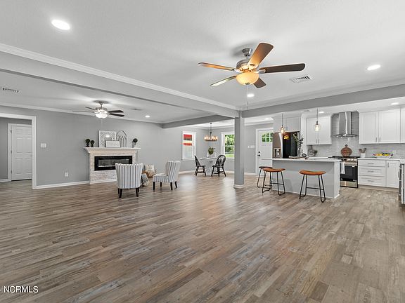 Welcome to your dream home! This beautiful 3 bedroom, 2 bath brick ranch on 1.4 acres offers an open floorpan with a stunning kitchen featuring quartz countertops, new cabinets, new stainless steel appliances, and large island with pendent lighting. Cozy up by the modern fireplace in the spacious living area. New HVAC system, new hot water tank, new windows, newly updated bathrooms. The primary bedroom features a modern ensuite with beautiful tiled shower. Enjoy the convenience of a dedicated laundry area. Outside, discover two detached garages with over 2500 sq ft , perfect for workshop, hobbies or storage. No HOA restrictions give you the freedom to make it your own. Conveniently located near HWY 17 and minutes from the Coast Guard base, this home offers easy access to amenities. Don't miss your chance to own this perfect blend of style and functionality - schedule a viewing today!