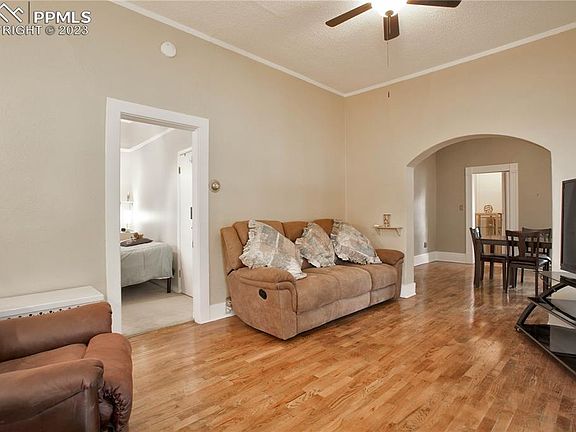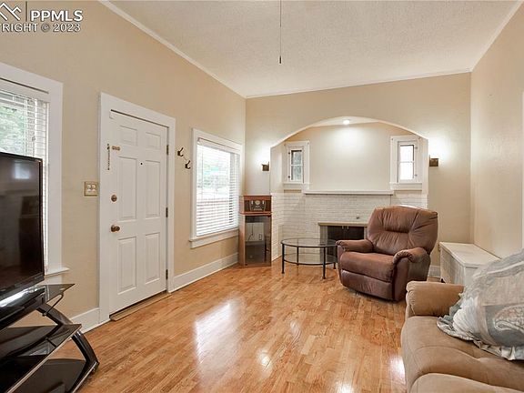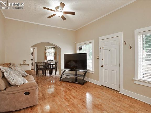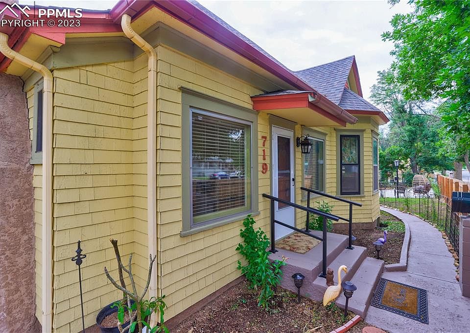 Historic Classic Cottage within 2 blocks of the pedestrian bridge to Monument Valley Park and access to downtown! This move-in ready home is on a full-fenced lot, has 9'+ ceilings throughout and features...12'x19' living room with gleaming hardwood floors, picture rail and arched Inglenook brick fireplace alcove...arched entry to formal dining room with bay window...updated kitchen with painted cabinets, all SS appliances included and butcher block high top table that adds extra counterspace when needed...6x10 butlers pantry off the kitchen with original built-in cabinet and shelves that can cleverly function either as a pantry or as a cozy office...10'x12' primary bedroom with window AC and access to the back hall and the bathroom...2nd bedroom with original divided light door...full hall bathroom with pedestal sink, 12x12 tile and large built-in linen cabinet...main-level laundry space with stackable W/D included...and basement great for small workshop, craft room or storage. Outside, you'll enjoy the beautifully manicured backyard oasis....sit on the bench swing on the stone wall enclosed, covered back porch and gaze at the mature trees...huge entertaining patio...dining deck platform...mulch/rock areas perfect for raised garden beds...artificial turf area...dog run and storage shed. Plenty of extra room on the property on the gravel area on the north side of the house...easy access to Old Colorado City, downtown & I-25...award-winning west side D11 schools...and R2 zoning for possible future ADU or vacation rental construction, too!