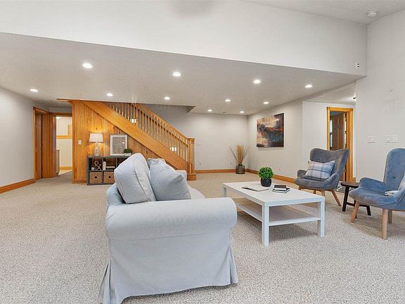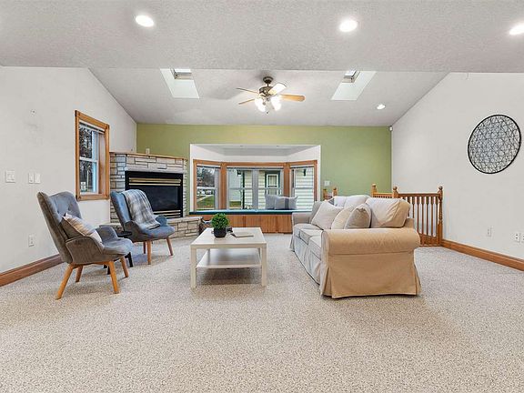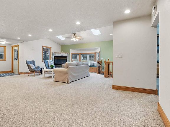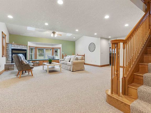 Welcome home to this beautiful 4 bed, 3.5 bath 2 story home! Boasting over 3,500 SF, this carefully designed home features an inviting great room with a corner gas fireplace highlighting a stone surround, bay window and a vaulted ceiling with skylight windows. Step into the renovated kitchen and you will find custom oak cabinetry, an expansive island, tile backsplash, vaulted ceiling and skylight windows. Kitchen opens to the dining area & cedar 4 seasons sunroom. Door to a spacious new maintenance free deck with pergola. Main level primary suite with double walk-in closets & open bathroom featuring heated tile floors a whirlpool tub and walk-in shower. Off the entry is a bonus room/office. Laundry room with half bath complete the main. Up the grand staircase you will find 2 bedrooms, a bonus loft area & full bathroom. Spiral staircase to the walk-out lower level features a family room, custom wet bar, 4th bedroom, bonus room, full bathroom with a tile walk-in shower and 2nd laundry hookups, large unfinished storage room that could be 5th bedroom and storm shelter. Oversized 2 car heated garage & storage shed included.