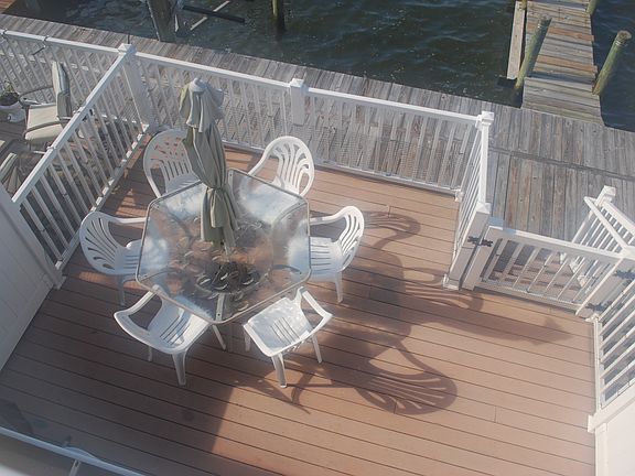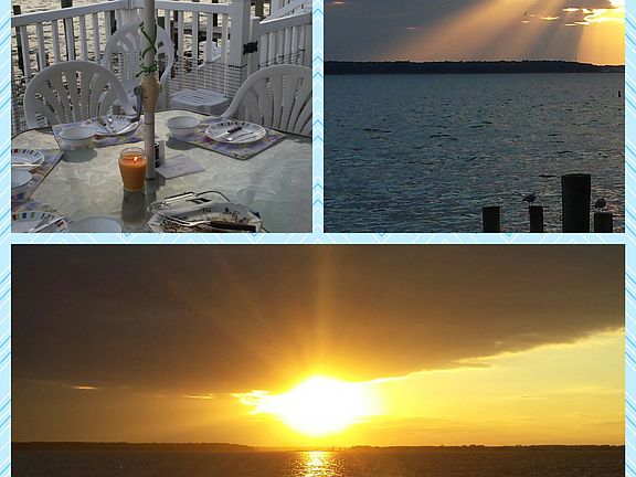 Sweeping south facing bay views, dock and 3 bdrm/2 baths. Affordable, yet million dollar view! Many updates inside including new corian quartz-look alike counters in kitchen, shiplap accents, and wide plank wood grain laminate flooring/subway tile in downstairs bathroom! Floor plan offers downstairs bedroom and full bath, wood burning fireplace and large living/dining area with wet bar. Upstairs offers master bedroom and 2nd bdrm with jack and jill bathroom setup. Lots of closet space and new HVAC in '12 (inside HVAC unit moved to inside vs. under unit!). Full size stackable w/d. Spacious decks both downstairs and off 2nd floor master! Electric on pier.