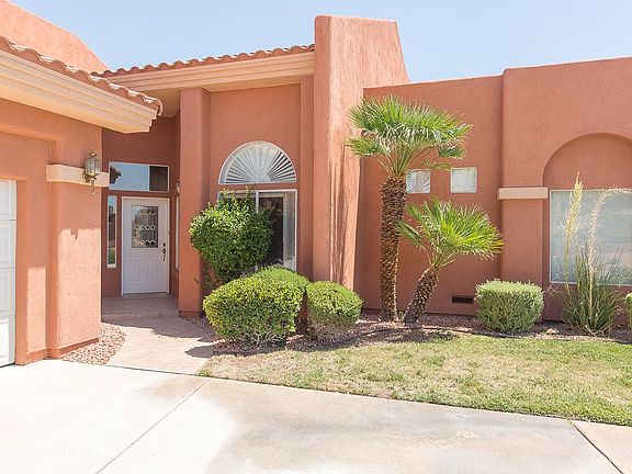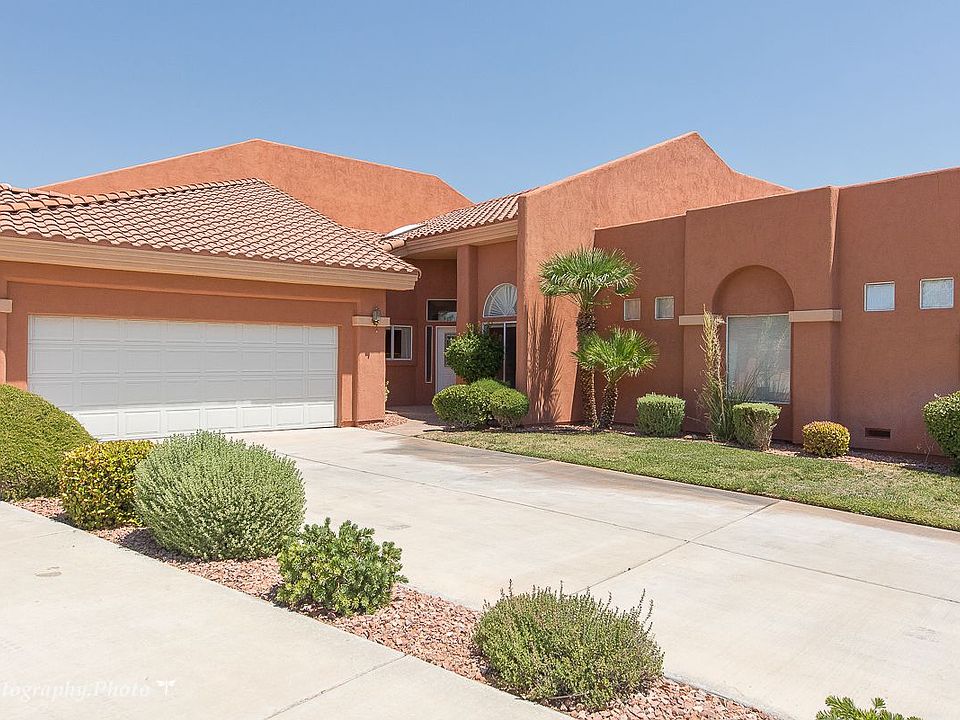"UNIQUE LOCATION"....Irreplaceable VIEWS of three golf courses...The Palmer, The Canyons and Wolf Creek Situated on the top of a hill with a 180 degree views of many fairways, the Virgin Valley Mountains and the valley below. Highly desirable eastern orientation provides incredible sunrises from your "oversized patio" and perfect protection from the afternoon sun when entertaining guests and showcasing your "One Of A Kind View". Patio has built-in BBQ where you can watch the golfers tee off the # 1 and # 2 tee boxes of The Palmer. Current owners walked through the front door ...saw the jaw dropping VIEWS and said "WE WILL BUY IT." Exceptionally large Master Bedroom showcases VIEWS through it's oversized floor to ceiling picture windows. BRAND NEW $10,000 "Variable Rate Speed A/C the operates quiet as a whisper. It's just outside master bedroom and you never even hear it hum. Homeowner bought a new refrigerator and dishwasher. YES..... they have included the washer and dryer with the sale of this home. All-inclusive HOA covers: Bldg maintenance, Property insurance, sewer, garbage, cable tv, Road maintenance, common areas, pool, spa and discounted golf fees.