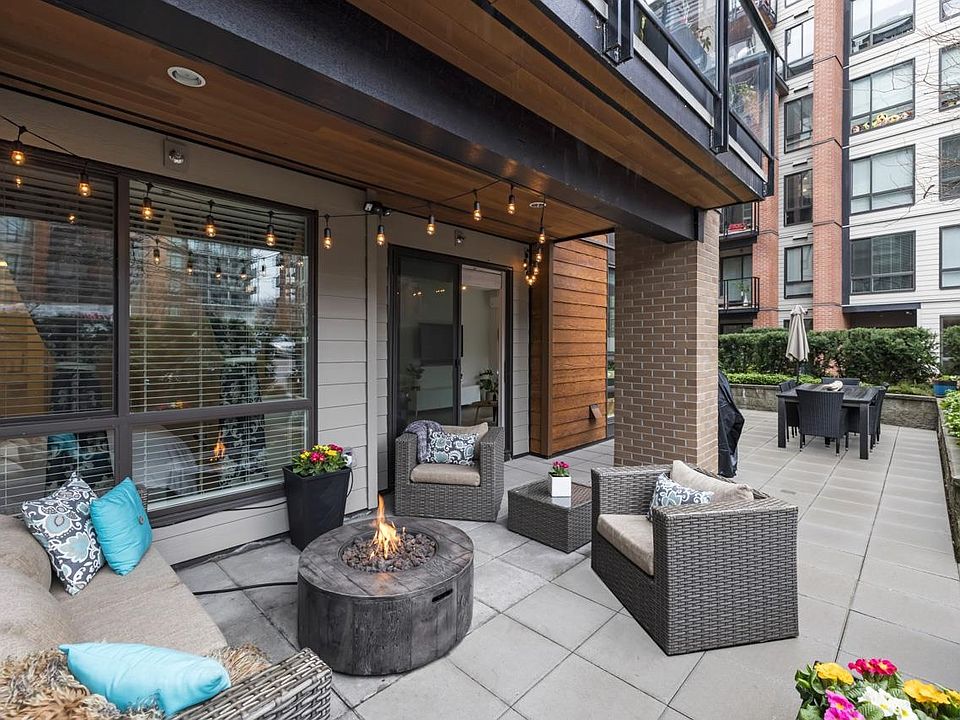Calling all entertainers! Spacious 3 bed garden level home offers a perfect blend of indoor/outdoor living. Rare 700+ sqft patio is ideal for gathering & dining al fresco, with entry through your own gate. Bright & airy, expansive windows, radiant heat, high-end finishes & many upgrades! Principal bedroom features walk-through closets & ensuite! Third bedroom offers a great dual-function space for home office and guests with built-in Murphy bed. Conveniently located, The Shore by Adera is pet/rental friendly, with gym/yoga studio/spin bikes & kids play area. Minutes from the Spirit Trail connecting to Shipyards & beyond! Steps to transit, amenities, Harbourside and more! Mosquito Creek offers a forested paradise minutes from your city home! Perfect for families, downsizers & upsizers!