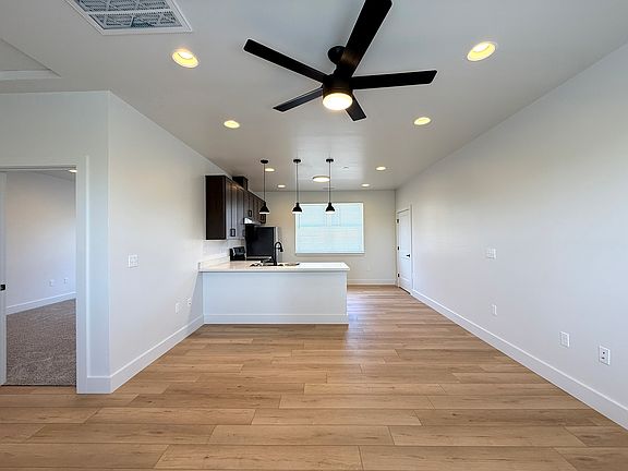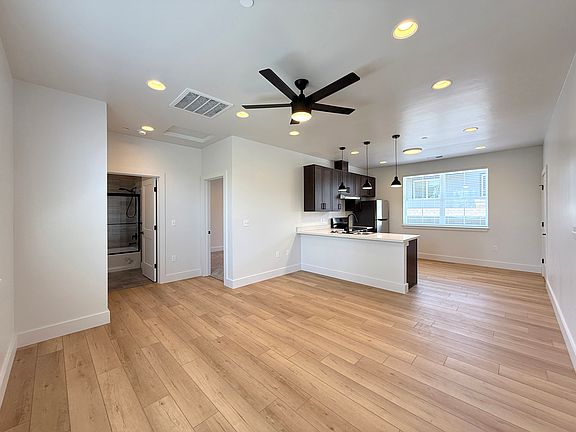 One bedroom, one bathroom second floor apartment with one-car attached garage. Beautiful brand new unit with many upgrades throughout including custom cabinets, quartz countertops, custom tile, custom fixtures, all appliances including dishwasher and garbage disposal, pantry, extra oversize storage closets, laminate flooring with carpeted bedrooms, garage with automatic opener and washer/dryer hook-ups, and small patio area. All electric with solar panels and air conditioning in each unit. Located close to shopping, restaurants and approximately two miles to Hospital. Apartment square footage is 693 sq ft and garage square footage is 362 sq ft., totaling 1,055 sq ft.Tenant pays utilities. No smoking and no pets. One year lease. Tenant pays all utilities. No smoking and no pets. One year lease.