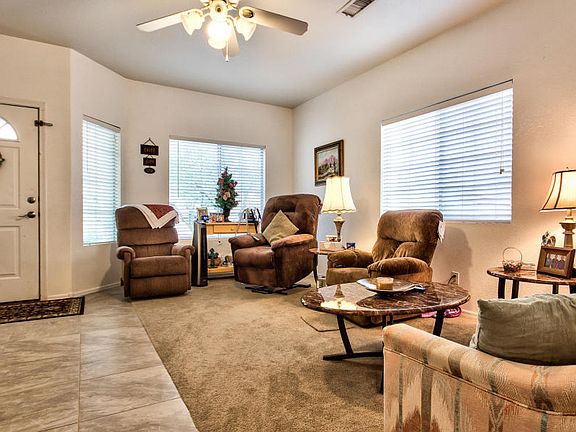 Oh My! Over 1300 sf this 3 bed 2 bath Cozy home sits on a large Cul-De-Sac Lot and is in immaculate condition! Climate Crafted dual pane energy efficient home with many extras. New Porcelain Tile and New Carpet Installed. Covered Patio, N/S Exposure, RV GATE. Freshly painted garage floor. Inside has 9 foot vaulted ceilings, Shade Trees. Master bath has 6 inch cultured marble garden tub and separate shower. Home has a spacious laundry room, great storage closets and nice pantry. Fantastic club house and community rec center with pool to enjoy! Come see your new home today!