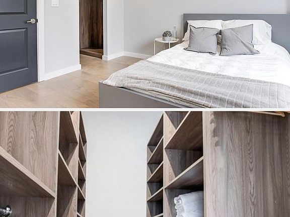 Oversized bedroom with a walk-in closet featuring custom shelving.