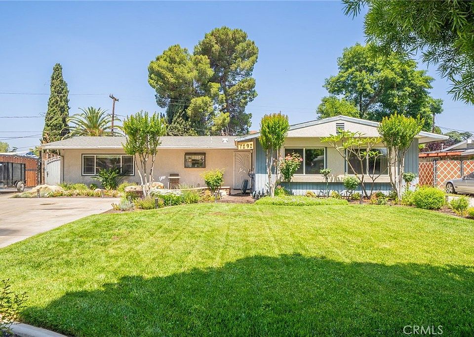 Welcome to 7191 Nixon Drive, a charming single-story home nestled on a tree-lined street in one of Riverside’s most established and desirable neighborhoods. This lovingly maintained 4-bedroom, 2.5-bath home is brimming with curb appeal and offers a blend of character and modern comfort. As you arrive, you're greeted by a beautifully landscaped front yard with mature trees, curbed planters and vibrant flowers. The extra-wide driveway provides ample parking, including space for RV or trailer access. Step inside to discover a warm and inviting living space featuring wood-style LVP flooring, custom tile fireplace, recessed lighting, and a spacious layout perfect for entertaining or relaxing with loved ones. The heart of the home is a generously sized kitchen with rich oak cabinetry, tons of storage, and appliances. It seamlessly flows into the open dining area, complete with sliding doors that lead to a covered patio—ideal for indoor-outdoor living. The backyard is your own private oasis, with a lattice-style pergola, large concrete are with covered alumiwood patio, and lush garden filled with fruit trees and flowering plants. The primary suite offers a peaceful retreat with ample natural light and an en-suite bathroom with walk in shower. Three additional bedrooms offer flexibility for guest rooms, a home office, or fitness space—one of which is currently set up as a charming exercise and reading room with scenic backyard views. The secondary bathroom is dressed with colorful original tile and a shower tub combination. Additionally, there is an indoor laundry room with ample storage and a direct exit to the backyard. A highlight feature of this home is the oversized 624 sqft detached garage with a permitted 1/2 bathroom and rear roll up garage door. This space is perfect for the car or off-road toy enthusiast OR can be easily converted into an ADU for in-laws or additional rental income. Additional highlights include dual-pane windows, updated flooring, dedicated laundry area, central HVAC, and tons of natural light throughout the home. The backyard’s thoughtful layout, mature landscaping, and privacy make it truly special. Located just minutes from shopping, schools, freeways, and parks, this home offers both tranquility and convenience. Whether you're starting your next chapter or looking for a forever home, 7191 Nixon Dr offers space, charm, and the perfect Southern California lifestyle.