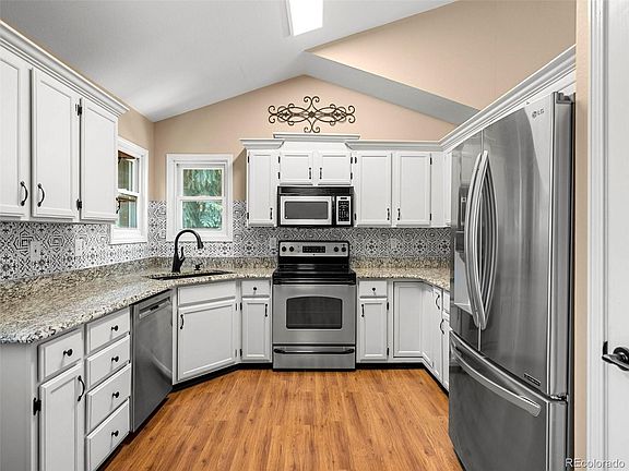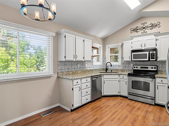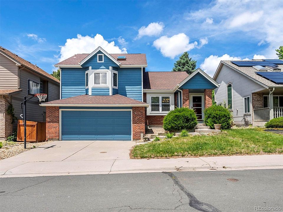 Great location alert! This home is within walking distance to Timberline Park and just a short drive to Lone Tree Golf Club, a Montessori School, two elementary schools, and several other parks and walking/biking trails. In addition to the location, this well-maintained home spans 2,387 square feet with 3 bedrooms, 3 bathrooms, a 2-car garage, and two living areas. The main level features vaulted ceilings in the living room and adjacent dining room and an eat-in kitchen with granite countertops and corner windows above the sink, bringing plenty of natural light into the space. The second living area has a fireplace and can serve as an additional family room or game room. The upper level contains all 3 bedrooms, including the primary suite with vaulted ceilings and a skylight, a sitting area perfect for unwinding or reading, a walk-in closet, and a 5-piece bath set. One of the two other bedrooms features double doors leading to the upper deck in the backyard and could be used as a spacious at-home office. Outside amenities and landscaping are a plus too, with good curb appeal and a built-in basketball hoop out front and a fenced-in backyard, and a large deck with room for a dining set and fire pit in the back.