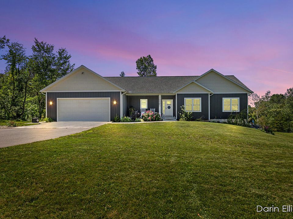 2021 Custom Built Executive Ranch on 1.4 Acres with 230' of Gorgeous private Marker Lake waterfront. Sprawling 4,000+ sq ft 5 Bed, 3.5 bath walkout ranch has it all. Extremely well built and designed with every intention of it being a 'Forever' home. Unbelievable kitchen with all the bells and whistles, quartz counters, hard maple cabinets, Walkin pantry with handmade burly maple shelving, snack bar, all stainless appliances, wine cooler, and more. Huge wide open Living space/Great room with beautiful gas Fireplace. Cathedral tung and groove pine ceilings and access to maintenance free rear deck that completes the panoramic lake views. Impressive main Floor Primary Bedroom with Private 2x vanity Bath w/ quartz counters, tile floors, and double shower head tile shower. Crazy Spacious walk-in custom California closet and access to that rear deck area. 2 additional good-sized bedrooms (one is the current owner's office), full bath, and a ½ Bath/ Main floor laundry room with burly maple shelving and a designated coat/shoe kickoff area. Both levels boast 9' ceilings. Walkout BSMT is fully finished and starts with an enormous Family/Rec area with a full kitchen area with Amish-built cabinets and more of that Tobacco Burly Maple. Large Covered patio access and more awesome Lake views. 2 additional Bedrooms or that perfect Exercise/office room, a bonus play/rec area/nonconforming 6th Bed, and tons of storage space. Oversized 2+ stall attached garage is entirely insulated/drywalled and has a large rear staging area for overflow items and mudroom area for everyday access into the house. Amenities are endless starting with a whole-house Generac generator, Vesta whole house water filtration system, deck and patio hard wired with NG, UG Sprinkling is plumbed, natural gas, high speed internet and more. Rural Setting yet on paved road and just a couple minute commute to I96 and easy 20-30 min jaunt to GR or Lansing. This one is a must see, hurry to show!