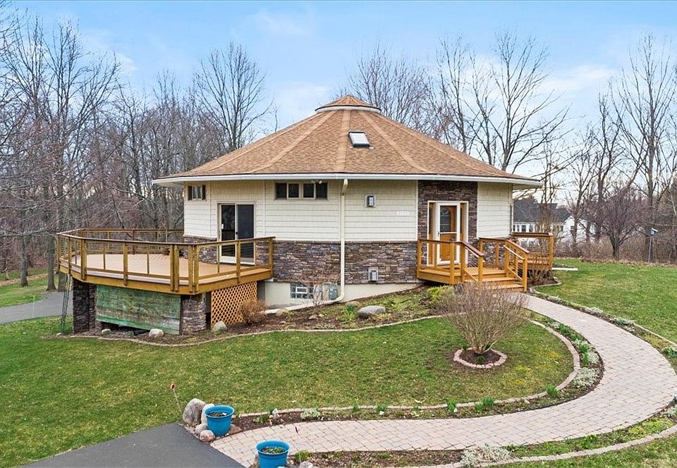 Opportunity knocks! 5 acres of either privacy to go along with this unique home or build your family compound on the other 2 beautiful spots on this parcel! Backing up to Champion Hills golf course view, fruit orchards or 225 ft of road frontage gives you lots of choices! Built by seller in her 80s this house of her dreams came to reality after she had seen a round home in Palmyra and couldn't get the thought of living in a round home out of her head! This home boosts 2 bedrooms and 1 full bath on the main level with an amazing open floor plan for entertaining! Floors and doors are all bamboo ! Beautiful fieldstone gas fireplace with walls of windows for a bright light filled room! Decking all around the outside to enjoy the views from up above! The downstairs has another full bath with walk in shower and a huge great room with another gas fireplace! You won't be disappointed with this one! There's nothing like it! Delayed negotiations 4/18 at 3pm