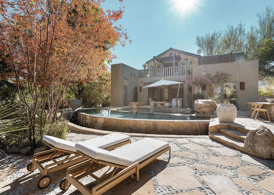 An impressive Short Term Rental investment opportunity, this modern European estate is nestled in the foothills of Palm Desert. Asymphony of old-world materials and contemporary design, this 1.05 Acre property will transport you to another world. Surrounded by lush landscape withhundreds of species, the rushing of a waterfall, and the constant chatter of local fauna you will feel a sense of peace and relaxation. Custom finishes abound inthis estate, with wood plank inlayed concrete floors, cobblestone driveway, onyx countertops, antique doors, and stone clad walls. The attention to detailcontinues to the exterior with an infinity edge waterfall pool and spa, solid granite chairs, carved boulder fire pit, and two hand crafted permanent concrete andstone exterior dining tables. This is a truly special property with beauty that is unrivaled by anything else on the market. Styled and staged by Lolo Interiors.