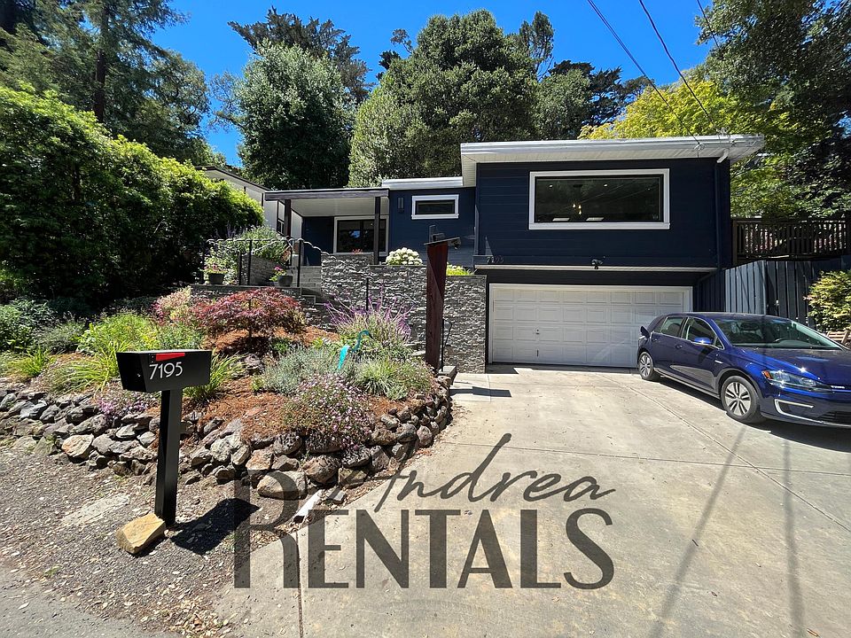 Stylish 3BD/2BA Montclair home with fantastic indoor/outdoor flow and newly installed Air Conditioning! Surrounded by East Bay Regional Parks (Sibley, Joaquin Miller) and just a 5 minute drive from Montclair Village, this updated mid-century modern gem is not to be missed. Two of the bedrooms as well as the kitchen and dining area lead out to the large, level patio and backyard. Wide-plank hardwood floors extend throughout the house, and there is custom cabinetry and storage tucked into nearly every room. From the flat driveway with 2 car garage, a drought-tolerant landscaped lawn slopes up to the front steps and a shady porch. The modern front door opens into a foyer and long living room, anchored on one end with a wide hearth, recently redone with Heath tile. From the living room, a doorway on the right leads to the open format kitchen/dining room, dining room, primary bedroom and amazing patio and garden area. The remodeled kitchen is a chef's dream, with floor to ceiling custom cabinetry, a large marble-topped center island with bar seating, and new stainless steel appliances including 4 burner gas stove. The kitchen is open to the sunny dining room, which has large windows as well as a sliding glass door to the side patio and yard. A landing off the kitchen leads to the stacked washer/dryer and folding station as well as the primary bedroom with custom ensuite bathroom. The primary bedroom is serene and spacious, with a wall of closet space, more custom cabinetry, sliding doors out to the patio and yard. The new, spa-like bathroom has a standing shower with a waterfall showerhead and pared down aesthetic. The home's other 2 bedrooms are on either side of a hallway just off the living room. The bedroom on the left has custom skylights, a corner window, and ample closet. The bedroom on the right has floating shelves, a door to the side yard, and a nook that has been custom built as a home-office. The renovated main hall bath between the bedroom has a deep tub with stunning Prussian blue Heath tile, floating Euro toilet, and great light from an overhead skylight. The stunning patio and yard for this home is actually along the right side of the house. It has a level, shady patio area that is accessed from the primary bedroom, kitchen, and dining room. Past the patio is a flat, grassy yard, begging for bare feet and picnics! Beyond the grassy area, the lawn slopes up to landscaped rock terraces, with pretty blooms and bushes year round. Redwood trees shade the yard, keeping it cool in the summer, and offering wonderful privacy and sanctuary. Awesome Montclair location, just a few blocks from Skyline Boulevard, Huckleberry Preserve and Sibley Regional Park - but also just a 5 minute drive to all the handy shops and restaurants in Montclair Village. Available now. Pet considered with additional deposit. Tenant is responsible for all utilities. Gardener covered by Owner Showing by appointment only take a Virtual Tour Now! Please email to take a look, and make sure to tell us something about yourselves! Caitlin Ball DRE #01822241 AndreaRentals: A Rental Concierge for Bay Area Owners and Renters Owner pays for gardener. Tenant pays for all utilities.