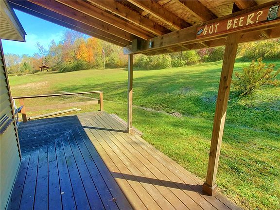 IT IS FOR SALE: UNTIL ITS SOLD. Don't wait, come see this property today. All season countryside views let you enjoy the summer months & the fall foliage just south of Prattsburgh. Take a look at this year round possible camp on 71 acres. GETAWAY to peace & quiet! No neighboring homes visible from the deck. TONS of road frontage on a town maintained gravel road, plowed in the winter months. Recreationalist, hunters, second home, camp, primary residence ... whatever your plans, this can work for you. Panoramic picturesque hillside views from the home. Get those summer get togethers going at the pondside picnic pavilion. Empire Fiber Optic high speed internet & ADT security system is on & active. Working wood stove keeps you cozy. 2 entry level bedrooms with 2 more possible on the 2nd floor. Bordered by NYS State lands on 2 sides: THOUSANDS of acres of NYS accessible lands here for hunting & recreation. The NYS lands on the North & East sides ensures your protected privacy. Insulated home with thermopane windows, vinyl siding,well & septic. The 28'x36' polebarn provides plenty of equipment storage. 2 storage sheds. Trails throughout the woods. Over 2500 ft of road frontage.