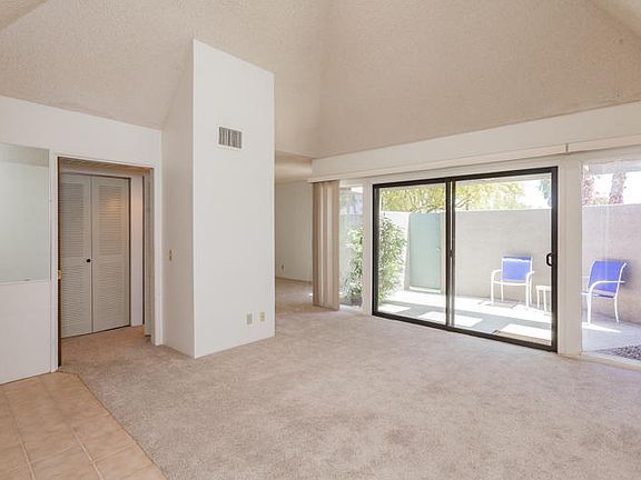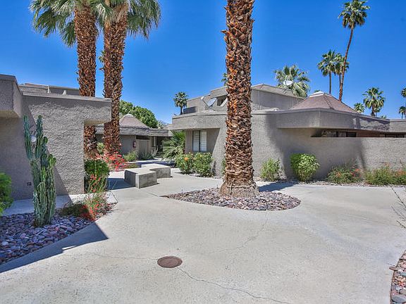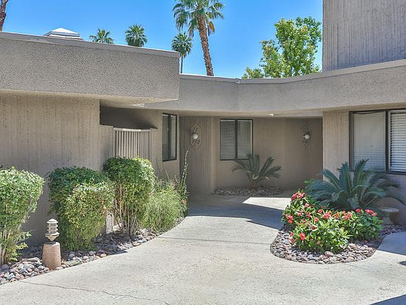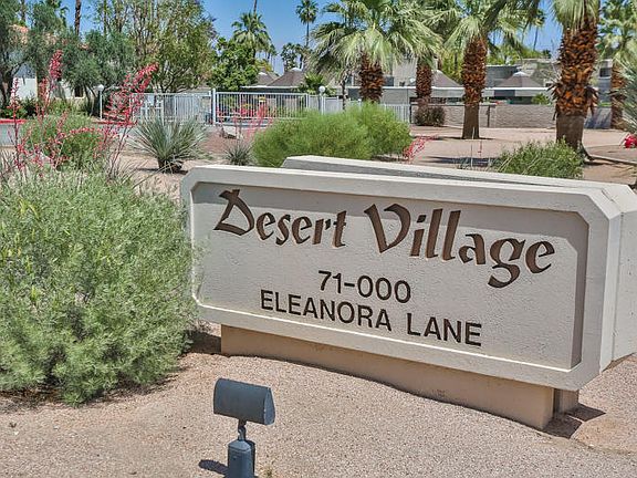 Desert Village is a ''Hidden Gem'' in gorgeous Rancho Mirage. This intimate gated community, has 86 units, surrounded by mature, lush landscaping and offers tennis, 3 pools heated year round, and Club House. Walking distance to ''The River'' entertainment center, enjoy shopping, movie theaters and dining options: P.F. Changs, Cheesecake Factory, Flemings Steakhouse and so much more! Or, walk across the street to enjoy a round of golf and resort amenities at the popular Omni Rancho Las Palmas Resort and Spa. Only a short drive to either Palm Springs or El Paseo (known as the Rodeo Drive of the East), this location can't be beat. 1Bd/2Ba, single story Condo, light and bright, with private, enclosed patio. There is a 2nd room with closet, used as a Den/Office but can be easily converted to Bdrm #2 by adding privacy door and operational window or slider. NEW in 2021: electric stove, stove hood, garbage disposal, Family Room & Kitchen blinds, faucet and toilet in full bath. NEW in the last two years: carpeting, washer/dryer, refrigerator, 8ft Family Room slider, and tub fixtures. Popular open floor plan, the Family Room has a dramatic 15ft ceiling with skylight. All appliances and washer/dryer included in the sale. Great weekend getaway or investment property. Priced to sell, a MUST SEE!