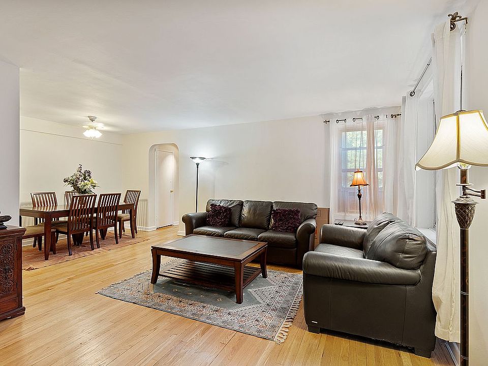 Are you looking to live in a quiet, residential neighborhood in the heart of Forest Hills? Welcome to the Willow Glen Building. Explore this spacious, 1BR apartment in move-in condition. The entryway leads to an open layout living room/dining area with two windows allowing for bright, sunlit exposure. The galley kitchen features large wood cabinets with generous cabinet space. The hallway leads to an updated windowed bathroom with vanity, tiled walls and floors. The large bedroom will accommodate any size bed with nature views. Freshly painted walls and rich, hardwood floors accentuate the space. (4) floor-to-ceiling closets for ample storage.