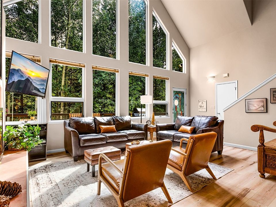 Embrace the mountain lifestyle in this stunning home, where sleek traditional design harmonizes with the grandeur of nature. Towering vaulted ceilings and large windows showcase breathtaking, unobstructed views of the White River National Forest from almost every room, allowing natural light to fill the space throughout the year. Whether you're hosting friends on the upper deck or relaxing in the bonus area on the Garden Level — enveloped by majestic aspens and adjacent to the National Forest, this home perfectly balances comfort and sophistication. Thoughtfully crafted for both relaxation and practicality, it includes a primary suite, two living areas, 2 bedrooms and a separate bunk area/bonus space, a dedicated laundry room, four bathrooms, Paved driveway and a spacious two-car garage equipped with built-in storage and a workstation, utility room, and plenty of space for all your mountain equipment. And the cherry on top? You're only an 8-minute drive from downtown Breckenridge. If the Mountains are calling, you Must go Experience the Beauty of this remarkable Mountain modern retreat today!