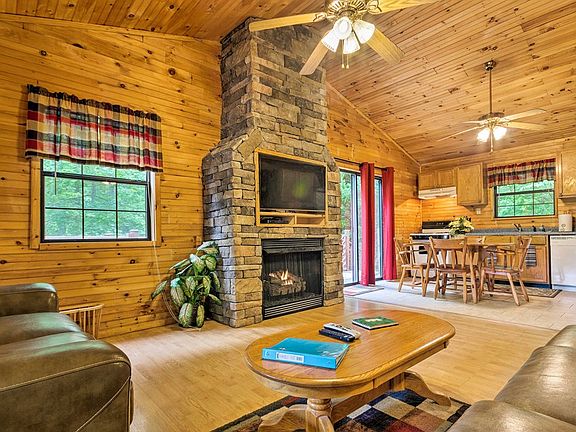Escape to the perfect mountain retreat, "Cherokee Windwalker" a 2-bedroom, 1-bath fully furnished vacation rental cabin nestled between Bryson City and Cherokee, NC! Enjoy the ease of main-level living featuring a spacious living room with vaulted ceilings, all adorned with beautiful tongue and groove finishes complimented by a romantic stacked stone gas-log fireplace. The eat-in kitchen opens onto a private side deck, perfect for al fresco dining with a BBQ and a relaxing hot tub to unwind under the stars. The two well-appointed bedrooms and a full bath provide comfort and convenience for your getaway. Step onto the full-length covered front porch and soak in the charm of the surroundings with a short-range view. Located just 5.3 miles from Harrah's Cherokee Casino, this cabin offers the ideal balance of tranquility and entertainment. Whether you seek outdoor adventures, casino excitement, bustling downtown Bryson City or simply a peaceful escape, this cabin is your ticket to the perfect mountain retreat!