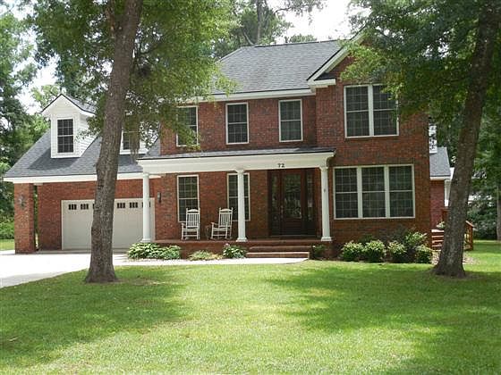 Coastal Living at The Pointe! Traditional all brick 2 story home situated on beautiful .52 acre lot majestic oaks,Deeded access to community dock.Covered front porch, 2 car garage,addit'l parking pad, out door shower, Entry hall gorgeous bamboo wood flooring through dining room, greatroom and library/4 bedroom/murphy bed/blt in book cases,Spacious formal din. rm,judges paneling, Butlers Pantry, Hickory Cabinetry-Kitchen, Granite C/Tops,Island-B/Bar,double oven wall units, gas stove/oven