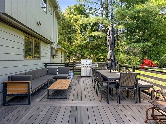 Chic, spacious, and full of character, this beautifully updated 3BR/2BA home blends contemporary style with timeless charm. Step into a sun-drenched living room adorned with classic parquet flooring, setting the tone for warmth and elegance throughout. The renovated eat-in kitchen is a chef’s delight, featuring sleek granite countertops, stainless appliances, and generous prep/storage space. Entertain in style in the formal dining room, where a cozy fireplace adds ambiance to every gathering. The vaulted primary suite serves as a true retreat, complete with a walk-in closet, private en-suite bath, and direct access to a serene deck—perfect for morning coffee or unwinding at sunset. An expansive deck overlooks a large, level yard offering options for entertaining, gardening, or play. The unfinished lower level provides abundant storage and exciting potential for future living space, while the attached 2-car garage adds convenience and functionality.