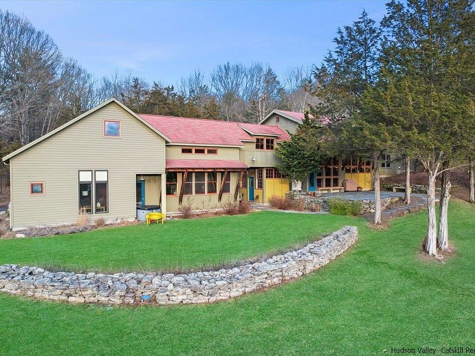 This stunning, custom designed contemporary is sited well off a quiet country road, just outside of Stone Ridge, in the charming, historic Hamlet of Kripplebush, NY. The mood of this home is captivating - bright and airy, filled with warming sunlight, with natures vistas everywhere. Walk in and immediately you'll appreciate its organic and understated luxury. By design, there was loving care and attention to detail, thoughtfully considered when the home owners undertook transforming this home. Soaring ceilings and expansive windows beckon. The new custom kitchen is a chefs dream; with an 8 burner Wolf stove, custom walnut cabinets with built-in shelves, a stainless-steel farm sink, soapstone countertops and Bosch refrigerator and dishwasher. Its center island gives the chef(s) in the family plenty of room to create fantastic culinary memories. This open kitchen flows into the dining room which boasts a stunning wall of windows. The view from the dining table includes an artisan bluestone patio, impressive rock walls and expansive meadows beyond...all providing the perfect backdrop for family gatherings and stellar entertaining. A custom white oak accent wall creates a warm focal point for the dining room. From your feet up, youll appreciate the warmth of radiant heat from the polished concrete floors. There are magnificent exposed timbers throughout the home, adding warmth and texture and drawing your eye upward to the bridge and 20+ foot ceilings in the dining and living rooms. A few steps up onto beautiful white oak flooring finds side by side living rooms, offering both a cozy space with a glowing fireplace and custom built-in bookshelves, and another with a spacious custom sofa nestled up against the wall of windows (a great place to cuddle up with a book or watch the wildlife moving through the meadow below). On this main level is also the large primary suite; a generous bedroom with oversized windows allowing beautiful views to fill the room, an en-suite bath and separate laundry room. A second bedroom and a full bath are on this level as well. Created with a custom railing system and white oak floors, the bridge gives you a birds eye view from the 2nd floor. It provides an impressive view of the property and of the main floor. This second floor has 2 more rooms, currently used as bedrooms. Towards the end of the bridge, and a few steps down, theres a room that connects the main house with the two-story wing. This space is ideal as an office or den and leads out and down to the studio/guest suite. The two-story wing of the house is an ideal flex space, offering many possibilities. Currently used as an office, guest suite and an artists studio, it has a smashing recently added full bath, and polished concrete floors with radiant heat on its ground level. Outside the meadows and curated Victoria Gardens flower beds are an oasis in an often hectic world. Set on 42+ acres, there's also a swimming pond and hiking trails leading back to the Kripplebush Creek. This wonderful, one of a kind property is centrally positioned to the local hotspots; Inness Hotel/restaurant/golf course, Arrowwood Brewery, Westwind Orchard, Minnewaska State Park, Mohonk Preserve and the Ashokan Reservoir rail trail. This is a truly special homestead. Private showings start today!