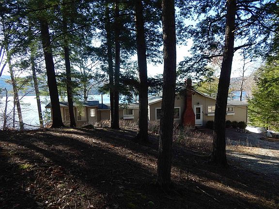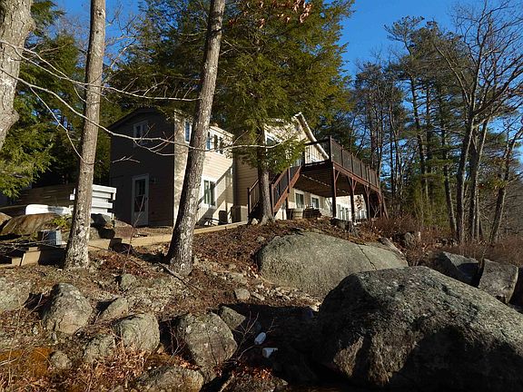 Rare to find property with almost 200 feet of direct waterfront on the easterly shores of Lake Massasecum, a desirable 400 acre lake. Panoramic views from west to south to east. Beautiful sunsets. Newer 60 ft long dock system. Year around residence on .87 acres. Deck 28'X12' off living room is 14 ft from the waters edge. Mt Sunapee Ski Resort less than 15 minutes away and Pat's Peak Ski Area about 6 minutes. Lot's of natural woodwork very well constructed, impressive oak stairway to lower level, newer foundation, central AC, updated systems. Two fireplaces one gas and one wood. Lower level mostly all finished living area. Both bedrooms have their own baths and the studio & office rooms in the lower level have a 3/4 bath with shower next to them. VIEWS from most all rooms. Same owners for years and same family for even longer. Comes partially furnished. Separate bunk house or storage building. Detached 2 stall garage.