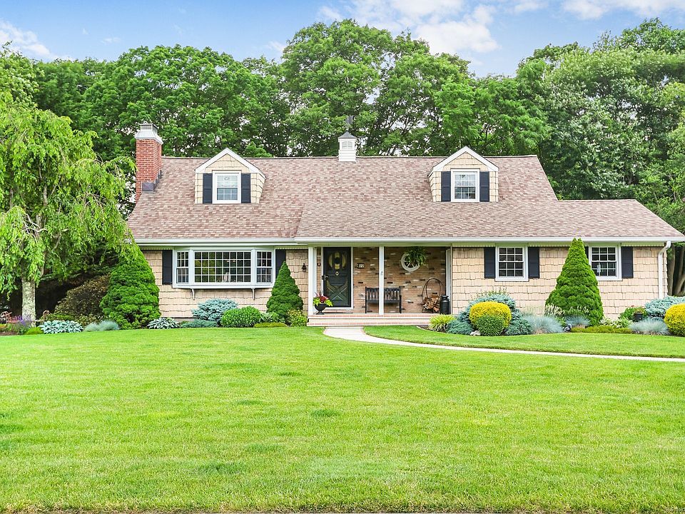 Home Sweet Home!! From curbside to backside, this home will not disappoint! A manicured yard ablaze with lush greenery & flowers encases this special home. With almost 3000 total sf, this custom built, dormered Cape has spacious rooms throughout. Upon entry, you'll be greeted by a sun-filled Living Room w/ wood burning fplc. & a formal DR. The updated Eat-In Kitchen features distressed cherry cabinetry, newer SS appliances & granite. Just down the hall is a remodeled, stunning Full Bath and access to the 2 Car Garage. Completing the main level is a comfortably sized Bedroom. Upstairs has 2 huge, dormered Bedrooms (each approx. 17x17), a 2nd Full Bath & walk-in closet. The finished, walkout Lower Level adds 812 sf and enjoys a newly carpeted Rec Room w/ bar, a separate Den w/ 1/2 Bath & Laundry as well as a large storage area. The outdoors offers unlimited recreational areas with an oversized Trex Deck, 2 stone patios (one w/ firepit) and expansive backyard ideal for pool or play! Central Air, Oil Tank in Basement (Gas avail in street if desired), 200 Amp Electric, Landscape Lighting (front & back), Vinyl Replacement Windows, Lighted Cupola & more. Short stroll to Jane Ryan Elementary. Mins. to restaurants, shopping and major highways. **Pls note: Property extends back to second stone wall in wooded area.**