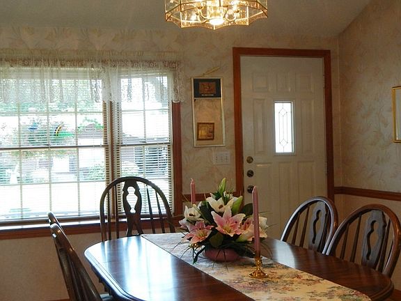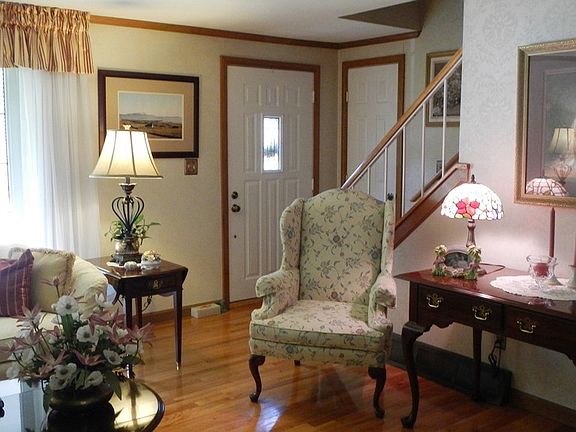 Well loved and maintained home boasts a family room addition with open floor plan and cathedral ceiling in family room addition off the kitchen. Updated maple cabinet kitchen has generous dining area and opens to a 400 square foot porch with view of the beautifully landscaped back yard with water feature upper and lower ponds. Pump remains for buyer's use. Hardwood floors in main rooms on first level. Very quiet setting but conveniently located to shopping and highway access. family room/DR addition, siding and replacement windows in 1993 APO. Lower level wood paneled play room adds extra living area if desired. The one car garage has a manual garage door opener in the rear, allowing access to the back yard.