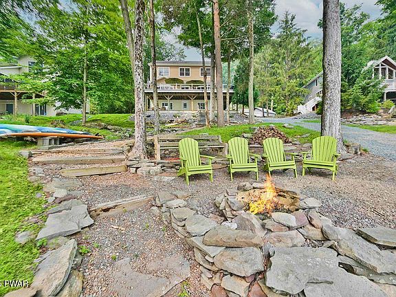 Luxury 5 bedroom, 4 bath Lake Wallenpaupack Lakefront with a gentle slope to the lake! This home has been recently remodeled and features a gourmet kitchen w/ quartz counters, custom tile backsplash, new cabinets, farm sink, large island, S/S appliances, Wolf gas range, beverage fridge, pantry & a farm sink. Entertain in the spacious dining room overlooking the lake or step outside to the wrap around deck to grill, entertain or relax. The Living Room features a stone fireplace, built in shelving (recently remodeled) & window seat - the perfect place to relax at the end of the day. Featuring 5 bedrooms & 4 baths including a primary suite w/ lake views & a second primary suite on the main level. A lower-level family room is the perfect area for having fun with a spacious family room, rec area and full bath. Lower level features a walk-out patio overlooking the lake and the path to the fire pit area and boat dock. Plenty of parking in the paved driveway plus a garage - perfect for a car, boat and toys. Upgrades also include: fresh paint, oak wide-plank hardwood floors on each level have been replaced, new railings, LeafGuard gutter guards, new Ecoflo septic tank, new primary bath vanity, tankless water heater plus insulation & heater in the garage. BONUS: Wallenpaupack Lake Estates amenity lot included! Central AC.