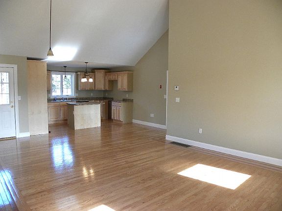 Young ranch has stunning entrance! All cathedral ceilings in open lr & kit. Hardwd fls w/ decorative edge, 2x6 Construction qualifies for Energy Star Rating. You choose carpeting for all 3 BRS, up to $18/sq yd.inc. Sunny,open lot is ready for your landscaping ideas. Covered front porch & stone walls in front add distinctive accent. As new, would be$300k to build. Come home over babbling Trout stocked brook. Built by Quality Contracting, my most recommended builder. Ask them to add deck.