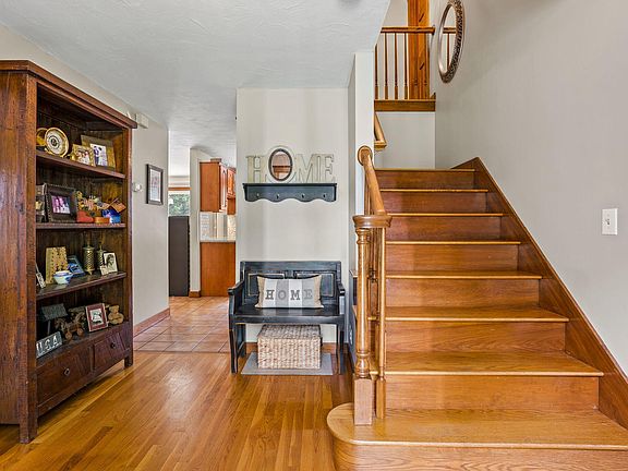 This home sits at the end of a winding drive on a 2.6-acre lot. The front entry sets the stage for this gorgeous home, with a brick walk, and flowering trees and plants. The foyer has wood flooring and an open stairway. To the left is a home office with pocket doors for privacy, and a formal dining room is to your right. After dinner retire to the cozy sitting room overlooking the rear yard. The kitchen offers wood cabinets, granite tops, stainless appliances, and a bay window. For casual meals, there is a dining area, with plenty of room for a table and access to a 1/2 bath. There is also a breakfast bar, and a sliding door to a large deck for outdoor dining. Off the dining room is a large room with cathedral ceilings, gleaming wood floors, and a floor to ceiling stone fireplace with a wood storage bin that also has exterior access. Back through the glass pocket doors you'll find a Great Room with a corner wet bar with granite tops, and beautiful cabinetry, cathedral ceilings, and wood floors. The gable wall features atrium windows, built-in cabinetry, and window seats. This room is surrounded by large windows that bring the outdoors in. Solar is OWNED and income producing! On the 2nd level, you'll find a lg primary suite, with wood floors, cathedral ceilings, a walk-in closet, and a private full bath. Bedroom 2 features access to a large unfinished space above the garage. 2 more bedrooms and a full bath finish off the 2nd level. With a 2 car garage, full basement, and a large storage shed, you'll have plenty of room for all your gear. The owned solar system produces a surplus of energy making the electricity costs almost non-existent. Central AC and a hook-up for a partial home generator.