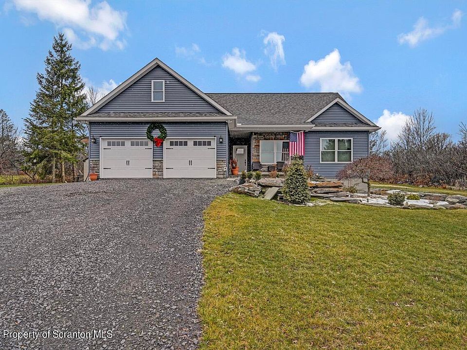 Check out this Fantastic 3 Bedroom, 2 Bath Ranch home built in 2022 situated on just under 1 acre in Lakeland School District. This Home has an open layout in the main living area. Living Room has a vaulted ceiling and is open to the dining room and beautiful kitchen. Master Bedroom features a tray ceiling as well as a nice sized walk in closet and private full bath. 2 additional bedrooms at the front of the home and a hall bath. Hardwood flooring in the main living areas as well as the Master Bedroom. Gas heat/Central Air. Full walk out basement can be finished for additional space and is plumbed for a bath. Patios have been framed but not poured yet.