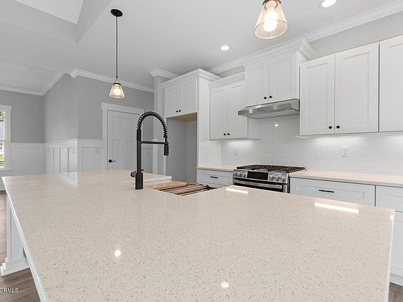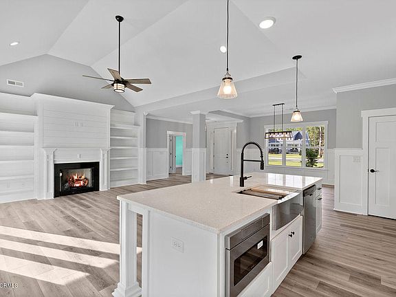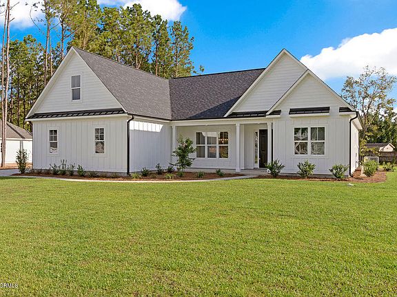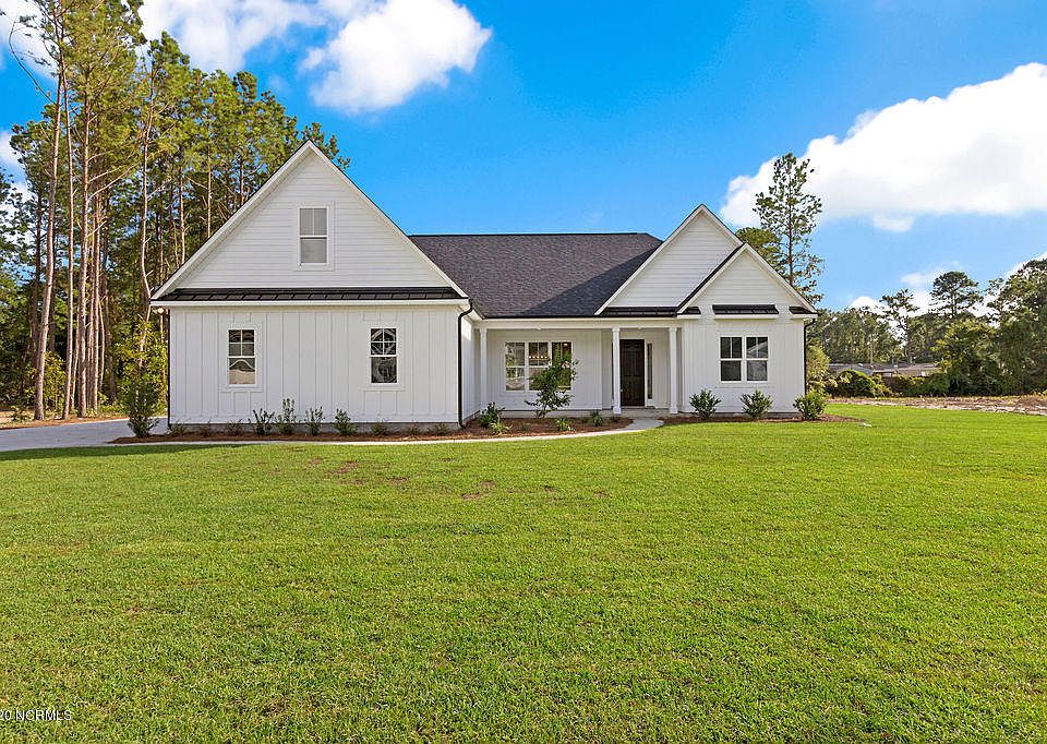 Sapphire plan features Board and Batten accented siding with metal accent roof, 4 bedrooms, 3 full bathrooms, bonus room & side load 2 car garage all on a 0.50 acre home site! Beautiful details inside and out. As you enter the foyer, it opens up to a vaulted ceiling in the Great Room w/ custom trim package throughout. First you notice craftsman wainscoting going around the entire common area plus ship-lap from floor to ceiling and built-ins on both sides of the fireplace. Kitchen features Quartz countertops with island & bar sitting area, tile back-splash, under cabinet lighting, soft close doors and drawers and a beautiful farmhouse sink! Gas Range with custom wood cabinet hood above it. Dining/breakfast nook has tons of windows for plenty of natural light entering the Kitchen and living area. Telescoping doors give access to the screened in back porch overlooking this wooded private lot. Master Suite has a full tile shower with rain-head and wall mounted shower heads plus your walk in closet with custom wood shelving and niches. Laundry room/ mud room with a sink is standard. Upstairs is the bonus room, an additional 4th bedroom plus a full bathroom. Outside full sod on front, back & sides of the property plus gutters all the way around the home. Discover Crown Pointe and enjoy larger home sites with custom new homes within walking distance to the waterfront dock & gazebo. No flood zone, located in the Topsail School District. Crown Pointe is a waterfront community with winding streets, double sidewalks, new pool & clubhouse and best of all a waterfront dock & gazebo with kayak launch and day-dock.