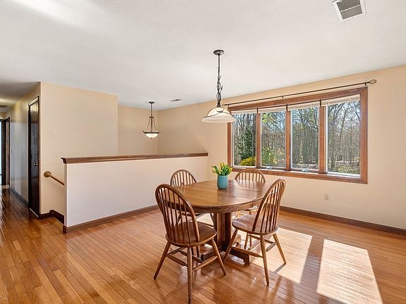 Welcome home to your inviting split-level ranch in this lovely and quiet neighborhood! Discover a charming front dining room with a bay window, a spacious eat-in kitchen featuring an ample island, and a sunlit living room with cathedral ceilings and stunning wood floors. Three good sized carpeted bedrooms boast ample closet space, with blackout shades in the primary and secondary rooms. The updated bathroom showcases craft-maid cabinets. Downstairs, enjoy a large family room with an electric fireplace, a functional office area, a convenient laundry room, and heated storage space. Outside you can relax surrounded by nature on a large low maintenance vinyl deck and enjoy a level backyard. Modern upgrades include a new propane boiler and hot water system (2023), upgraded electric (2023) APO, roof replacement (2018), new well pump (2020), and septic installation (2013) APPO. This home is move-in ready for you to begin making unforgettable memories!