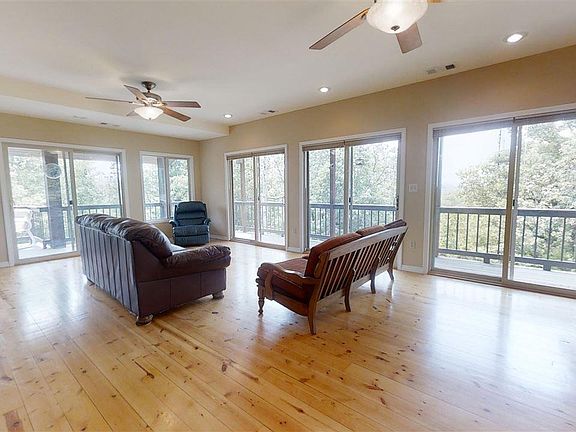 Custom built home on 10 wooded acres joining government strip. This home has covered wrap around Trex decking. Walk out basement and main floor with master suite and large open living room into kitchen/dining. Upper level has large flex room perfect for home theater or second master suite. Very private setting near the Bull Shoals Lake and boat launch for fishing, swimming and boating.