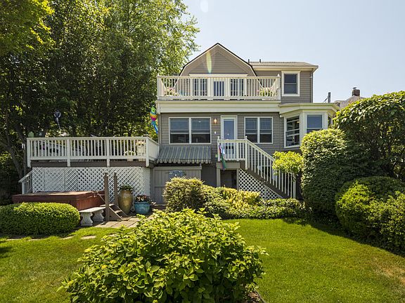 This jewel box sits on the hill overlooking Sandy Hook Bay, the ocean & NYC on the horizon. A very special home, it began as a Victorian carriage house and has since become an exquisite 3BR/2BA residence with updated kitchen & baths, central air, newer windows & many modern conveniences but has retained the beadboard ceiling & wall treatments, hardwood floors & period charm which make it so unique & inviting. Wonderful views abound: from the kitchen, three season sunroom, dining room, master bedroom & bath, and, of course, from the large outdoor deck, master suite terrace & the beautifully landscaped backyard complete with hot tub & outdoor shower. A short walk to the beach & close to the NYC ferry. Add'l storage in shed, basement & workshop. Totally move-in ready. Come fall in love.