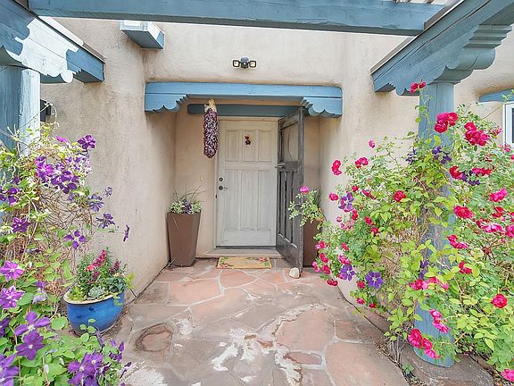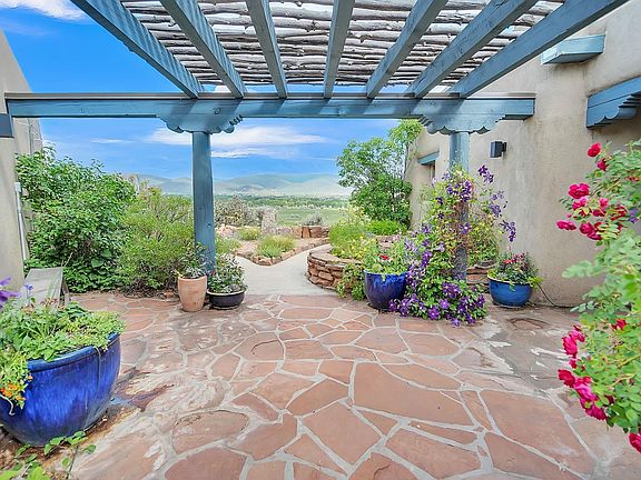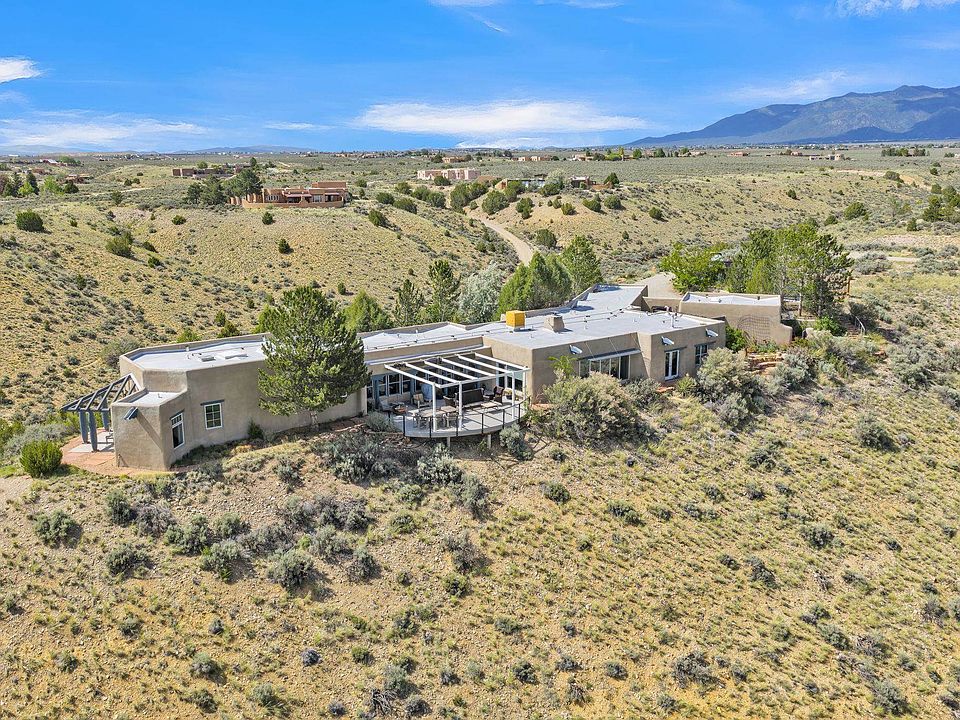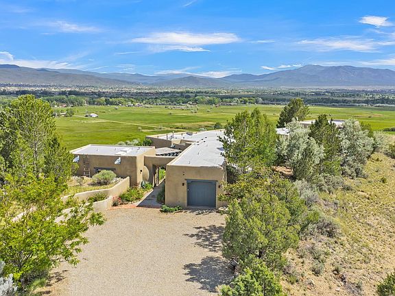 Architectural Masterpiece on the Blueberry Hill Mesa with Unbeatable Views ~ Perched majestically atop a knife edge ridge in the Blueberry Hill neighborhood of magical Taos, New Mexico, you will discover this architectural masterpiece with unbeatable panoramic views. Formerly an artist's retreat designed by renowned architect Robert Parker, this very special property isn't just a home, it's a statement and testament to visionary design offering an unparalleled living experience. Enter through the lush, blooming, and colorful breezeway and make your way into the 3,252 sqft main home, featuring 3 bedrooms and 2.5 baths, boasting endless historic charm and cutting-edge contemporary luxury. This innovative linear designed home, anchored by a graceful galleria, connects an inviting interior space with numerous meticulously maintained outdoor areas. Step into the sleek, state-of-the-art kitchen which is a true chef's dream and gaze hard out the wall of windows that frame the Sangre de Cristo mountains like no other. All of this outfitted with Caesarstone countertops, a Bosch cooktop, Gaggenau oven, Thermador refrigerator, and exquisite Bulthaup German cabinetry, it's as functional as it is beautiful. Throughout the dining room, living room, and primary folding suite, you will discover 125-year-old vigas reclaimed from historic structures, which infuse the home with a rich sense of history and character. The thoughtful split floor plan offers both privacy and fluidity, with the main living area at one end and a serene master suite at the other, complete with a large studio and a tranquil meditation room featuring unique Chaco-style stone walls. From the expansive deck just beyond the wet bar, gaze upon the prolific Taos Valley unfolding below, with a historic acequia winding through the landscape on the edge of the Ranchitos Valley, with majestic Taos Mountain standing proudly in the distance - every window frames a living masterpiece, ensuring you're constantly immersed in the beauty of your surroundings. Completing this exceptional property is a charming 556 sqft guest house, the ideal private sanctuary for visitors right next to an elevated stone terrace with a large HotSpring tub offering more tremendous views in all directions. The property is meticulously manicured surrounded by variety of perennials and desert shrubs that are kept green by drip irrigating from the private well is tapped into a pristine aquifer. A residence as spectacular as 72 Nighthawk Trail is a rare rare find, and especially so at this desirable price point. Don't wait before it's too late, reach out to witness this New Mexico masterpiece today.