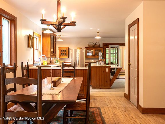 Tucked away at the end of a winding dirt road, The Fern House is simply in a world of its own. Surrounded by 6.7 magical wooded acres, filled with black birch trees, and bordered by 250 acres of woodland, you will find total privacy: just ferns, trees, and the sounds of nature. You can sip coffee on the porch, listen to the birds (the wood thrush are legendary), and watch the woods come alive-or host friends and family in a home that was built to be shared. Home of a writer, the 2,400 sq. ft. space offers ample living area with an open living area, high ceilings throughout, three large, light-filled bedrooms, including one so large it could be divided, and two full bathrooms, including a soaking tub surrounded by windows. The spacious kitchen features cabinetry custom-made in England by Smallbone of Devizes. Off the kitchen, you'll find a cozy office, and reading room to enjoy the peaceful nature from the windows year-round. Hardwood floors stretch throughout, and natural light pours in. The open L-shaped layout offers both living and family room spaces. Non-toxic finishings throughout. This home is a ready-to-layer canvas for the finishings of your choosing, on a peaceful, private Rhinebeck lot that is increasingly harder to find. Many recent updates include a newly graveled drive, new interior and exterior paint, new fixtures, a new stainless steel fridge, a new washer and dryer, a fully renovated laundry room, tiled shower, and vanities. The full, walkout, B dry, level basement is ideal for finishing into additional space, and the acreage offers plenty of opportunity for additional lawn if desired. When you're ready to connect with the outside world, Rhinebeck is just 5 miles away. Known for its historic charm, farm-to-table dining, boutique shops, and a vibrant arts scene. Rhinebeck is one of the most sought-after towns in the Hudson Valley. Living here means you can enjoy total seclusion at home while still being minutes from culture, community, and convenience.