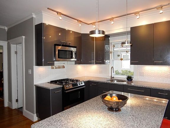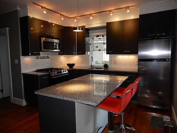 Beautiful Philadelphia style 3 bedroom townhome in the prestigious Upper East Side neighborhood on Orient Avenue with easy access to public transportation and the vibrant downtown Melrose. This unit offers all the modern amenities while maintaining the charm of the original architectural period details including a large covered front porch, stained glass windows, high ceilings and crown moldings. The two level floor plan features a first floor master bedroom and bath, hardwood floors, custom lighting, central air and beautifully tiled baths. The kitchen features granite counters and large island, SS appliances and bar area with built in wine fridge. Exclusive laundry space includes LG washer/gas dryer and ample storage.