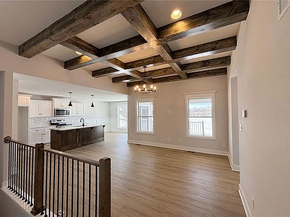 Beautiful BRAND NEW home with a finished WALK OUT basement offering privacy and a peaceful view backing up to quiet acreage in Meadow Creek Subdivision just minutes away from Whiteman Air Force Base! You will not find another home with high quality finishes and details for this price! Open floor plan with stunning geometric beams and vaulted ceilings*Covered Deck with stairs AND covered patio*Custom Painted Cabinets*Quartz Countertops*Kitchen Island*WALK IN Kitchen Pantry*Stainless Steel Appliances*Luxury Vinyl Plank floors*Stylish Lighting*Main Level Laundry Room*Convenient Drop Zone Area with Custom Boot Bench and Coat closet*Durable designer stair carpet*Large master bedroom, master bathroom w/double vanity, shower & large walk-in closet. Pictures are of the actual home.